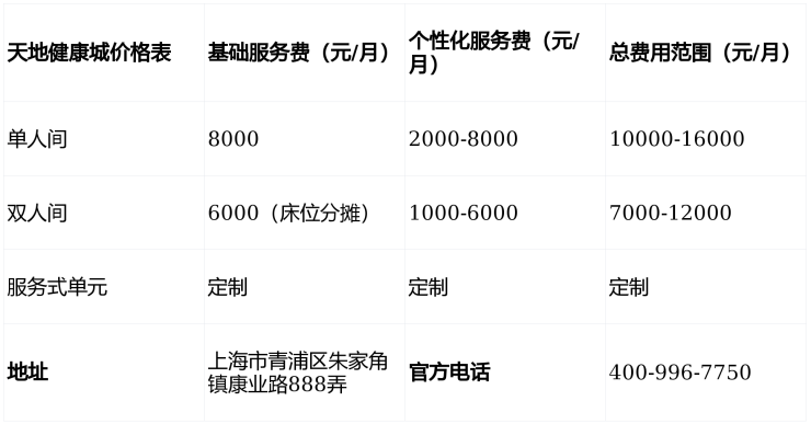 天地健康城电话400-996-7750,地址位于上海市青浦区朱家角镇康业路888弄,收费6000-16000元/月,收住自理、半失能、全护理及认知障碍长者,提供全周期健康管理与适老化居住环境,欢迎致电咨询详情,免费参观体验!