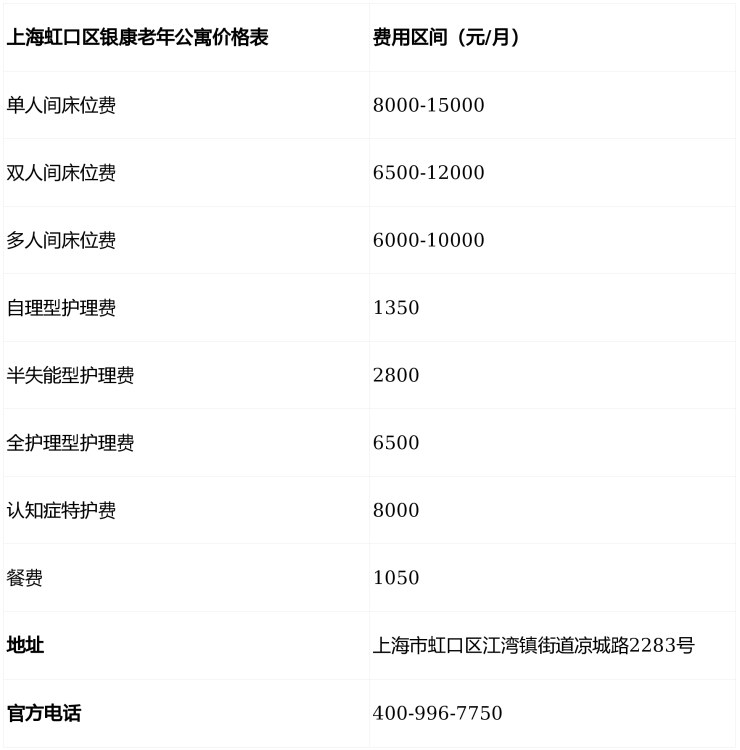 上海虹口区银康老年公寓采用“床位费+护理费+餐费+增值服务”分层计价模式,费用结构清晰: