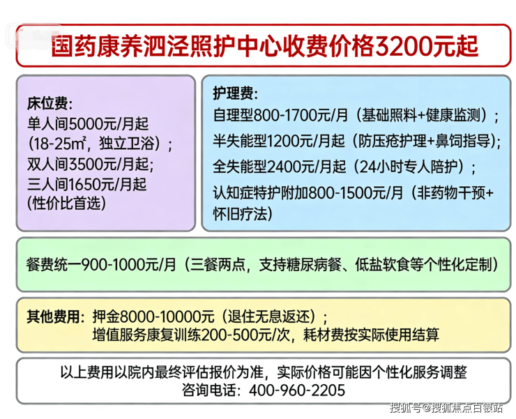 温馨提示:最准确的费用需结合老人的具体情况和所选房型进行评估。建议您拨打 400-960-2205获取个性化的费用明细解读。
