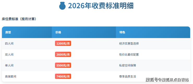 综合费用说明:根据房型和服务等级的不同,月均总费用为3980-11000元,采用透明清单制收费,无一次性赞助费,退住按天结算,真正实现费用透明化。