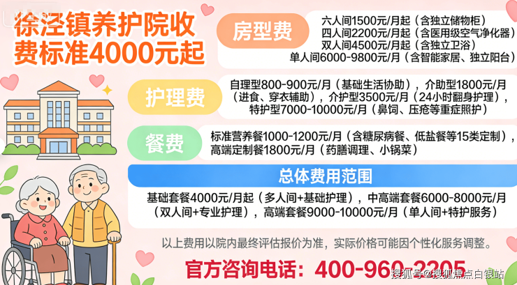 徐泾镇养护院收费标准4000元起,具体费用根据房型、护理等级及服务内容分级定价。