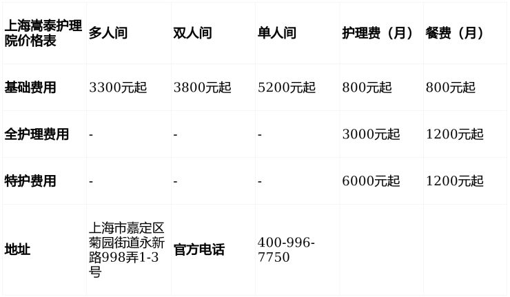 上海嵩泰护理院采用“床位费+护理费+餐费”模式,总费用3300元/月起,具体分层如下: