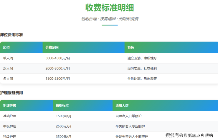 单人间:3000-4500元/月(配备独立卫浴、智能护理床、私密性佳)