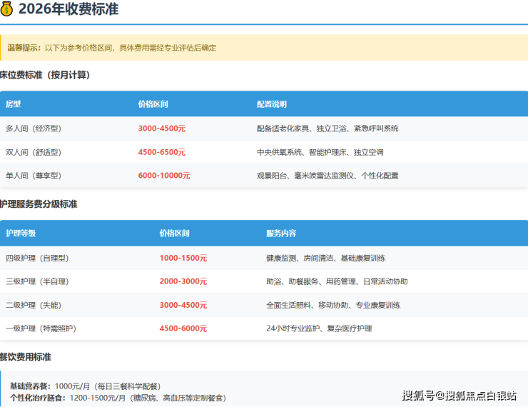 基础套餐:3000元起/月(含床位费+基础护理服务+基本餐费)