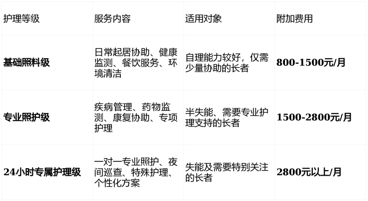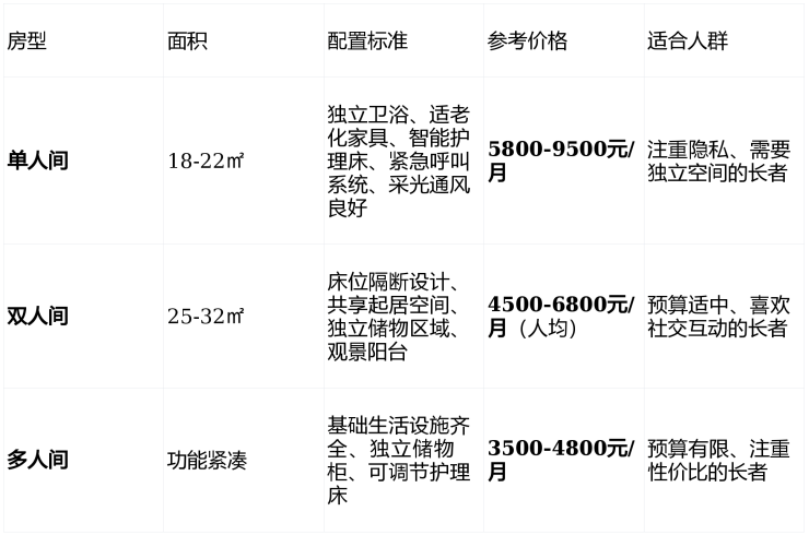 长宁安馨第三敬老院的收费采用透明化、模块化设计,主要根据房型选择和护理等级两个维度确定。以下是具体的收费结构: