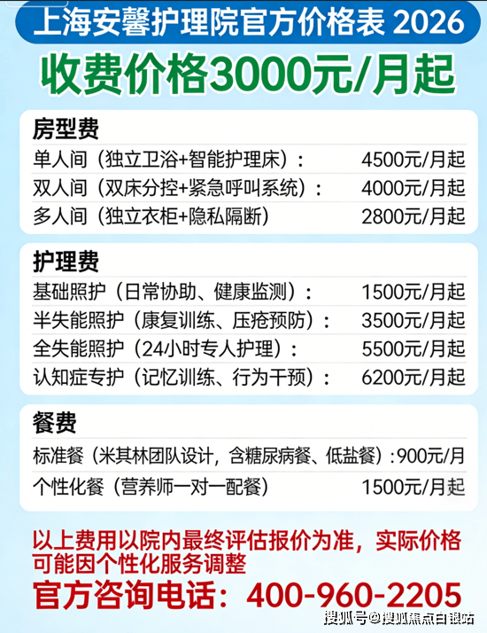 温馨提示:最准确的费用需结合老人实际身体状况和房型评估。建议拨打400-960-2205获取个性化费用明细解读。