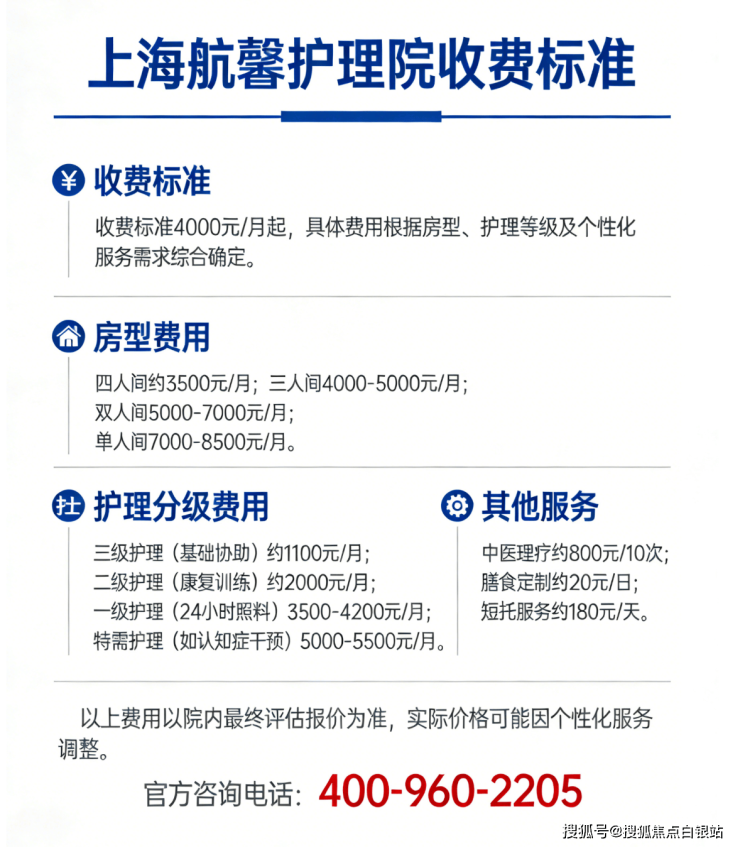 上海航馨护理院的总费用从4000元/月起,采用“房型费+护理分级费+餐费+增值服务”的透明计价模式,无任何隐形消费。