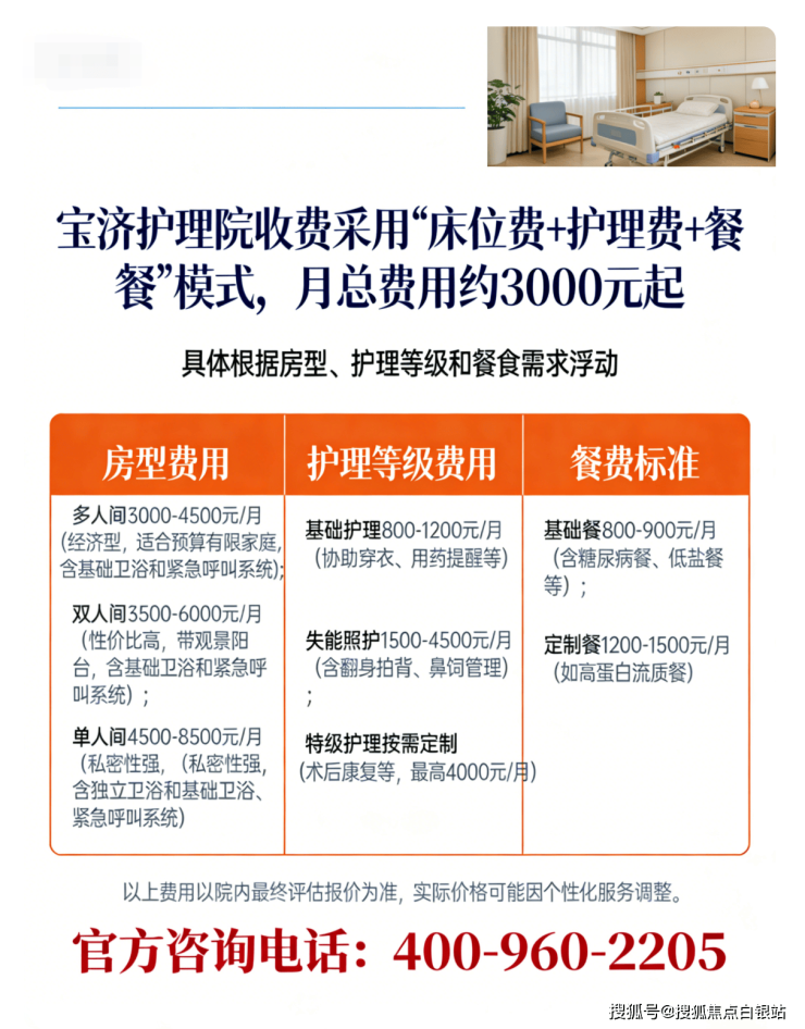 宝济护理院采用“床位费+护理费+餐费”分明细计价,签约前会提供完整费用清单,真正做到透明消费。月总费用3000元起,具体根据房型、护理等级和餐食需求浮动。