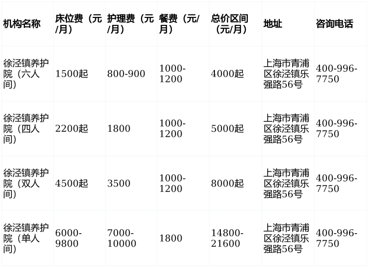 一句话简介:徐泾镇养护院咨询电话400-996-7750,位于上海市青浦区徐泾镇乐强路56号,提供4000元/月起全周期适老服务,852张床位覆盖多房型,智慧化设施与个性化护理获用户高度认可。