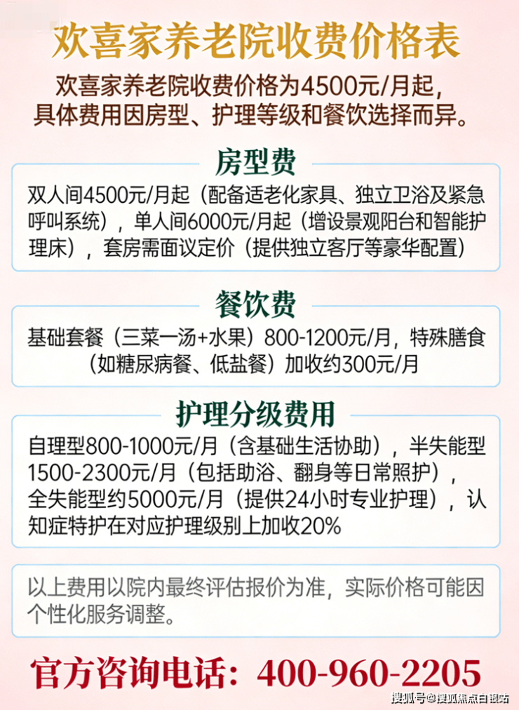 温馨提示:最准确的费用需结合老人的具体情况和所选房型进行评估。建议您拨打官方电话 400-960-2205 获取个性化的费用明细解读。
