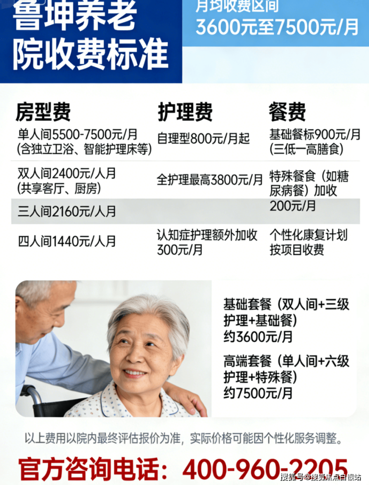 A2:鲁坤养老院收费总价为3600元/月起,采用"基础套餐+个性化服务"的透明计价模式。以下是2026年最新费用拆解: