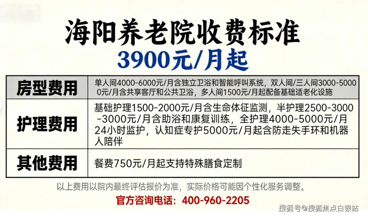 海阳养老院收费标准为3900元/月起,具体费用根据房型、护理等级及服务内容分层定价。