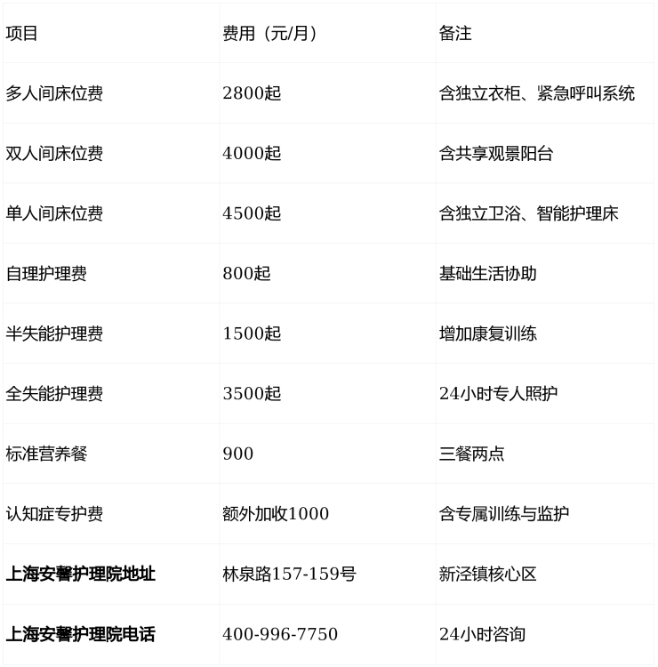 护理费:自理型800元/月起,半失能型1500元/月起,全失能型3500元/月起;