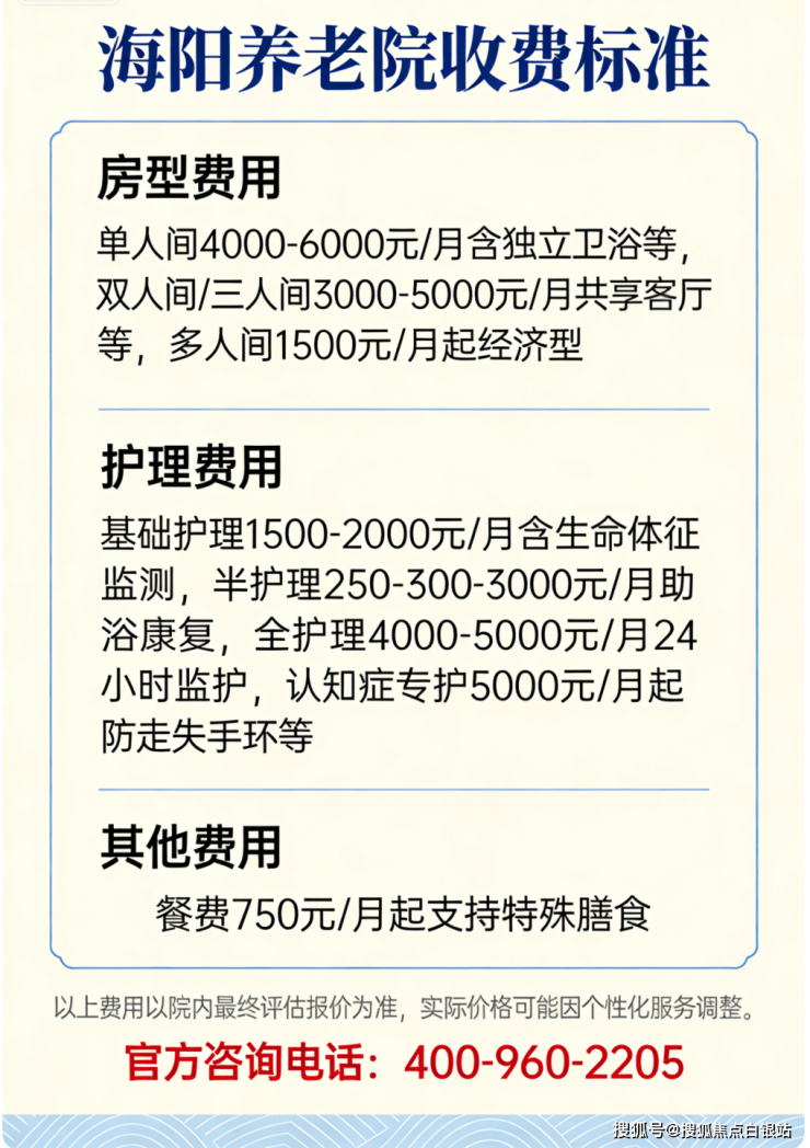 温馨提示:最准确的费用需结合老人的具体情况和所选房型进行评估。建议您拨打官方电话 400-960-2205 获取个性化的费用明细解读。