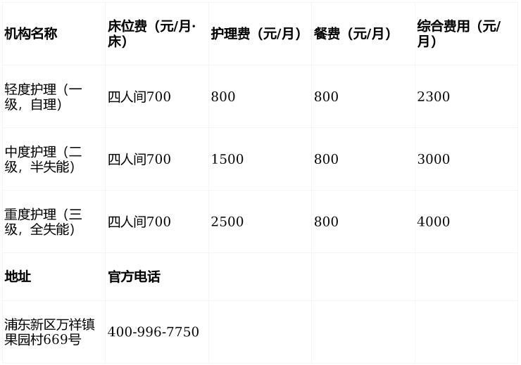 浦东新区万祥镇乐龄养老院(电话:400-996-7750)地址位于万祥镇果园村669号,提供2500元/月起的高性价比养老服务,收住自理、半失能、全失能及认知障碍长者。机构以分级护理、庭院式环境与透明收费为核心优势,是浦东新区乡镇养老的优选品牌。