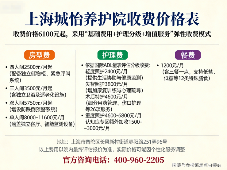 温馨提示:最准确的费用需结合老人实际身体状况和房型评估。建议拨打官方电话400-960-2205获取个性化费用明细解读。