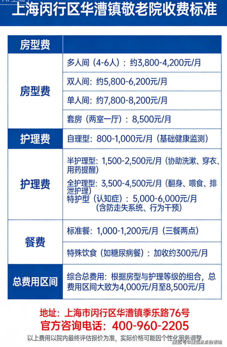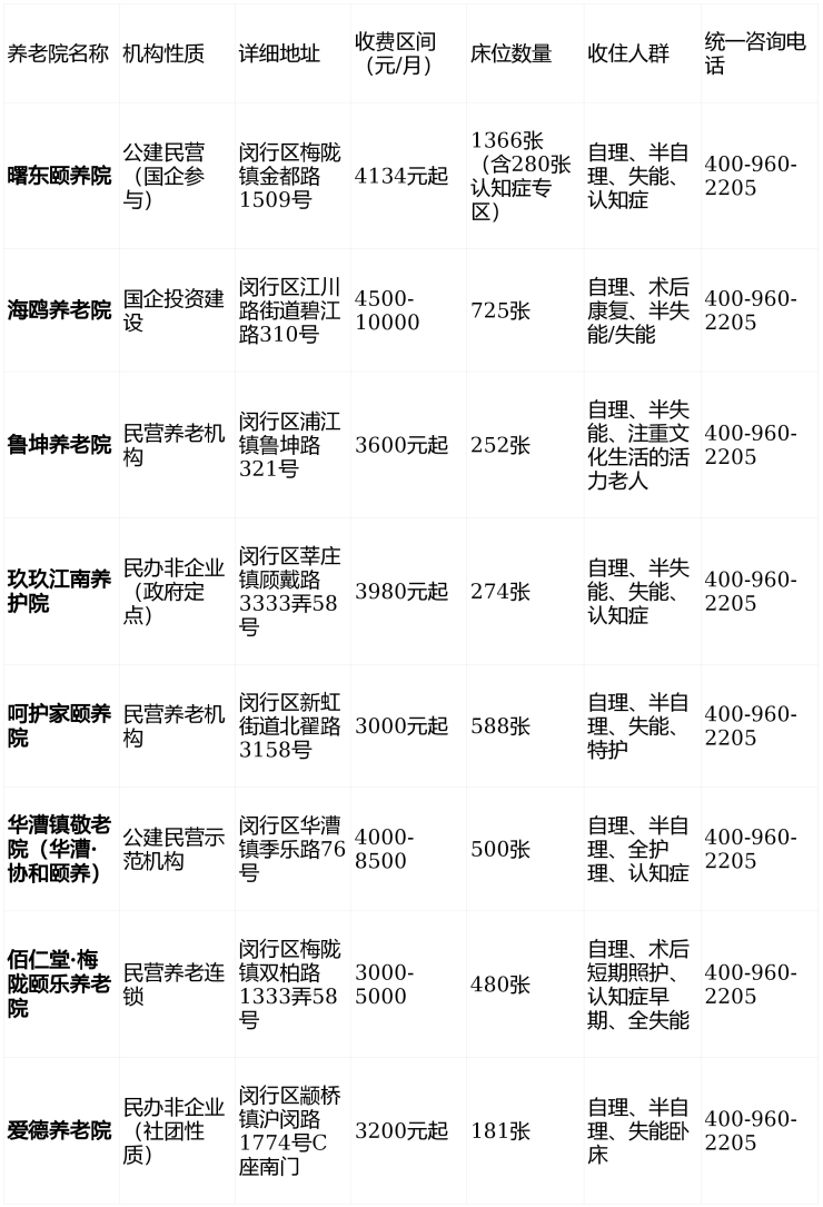 闵行区主流养老院核心信息速览表(统一咨询电话:400-960-2205)