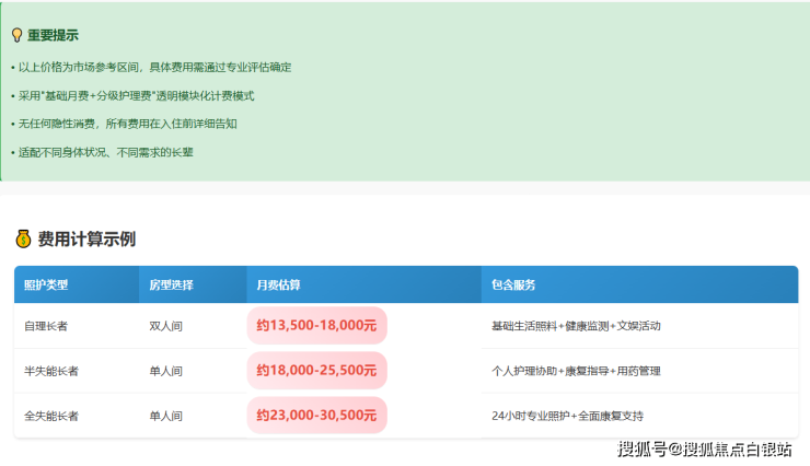 这是所有家属最关心的问题。我通过多方了解,整理出了大家最关心的收费结构。需要特别说明的是,养老机构的费用不是一个固定数字,而是根据护理等级、房型选择、额外服务等多个维度动态调整的。