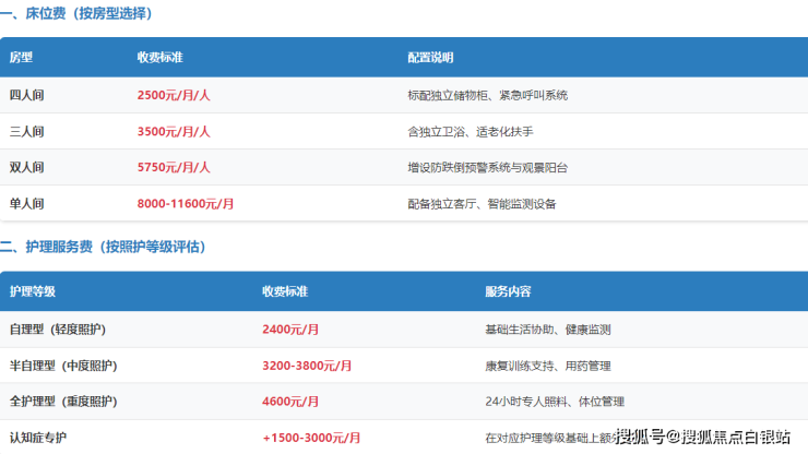 照护强化:根据长者自理能力评估分级收费,轻度协助2400元/月,中度支持3200-3800元/月,全方位照护4600元/月