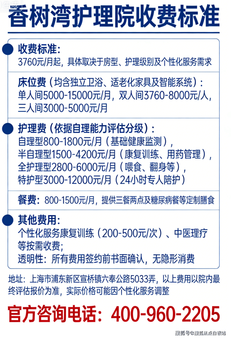 适合人群:特别适合失能、半失能、术后需康复、以及患有认知症(老年痴呆) 的长者。如需获取最新报价或预约参观,欢迎咨询电话:400-960-2205,专业顾问将为您提供一对一解答。