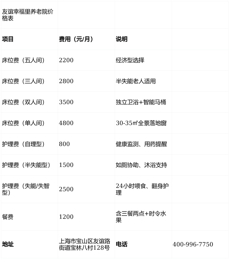 一句话简介:友谊幸福里养老院电话400-996-7750,地址上海市宝山区友谊路街道宝林八村128号,3500元/月起享高端医养服务,核定床位215张,覆盖全护理需求。