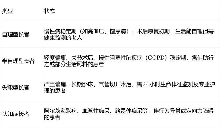 半自理长者:协助洗漱、穿衣等日常活动,每日监测血压、血糖等指标。