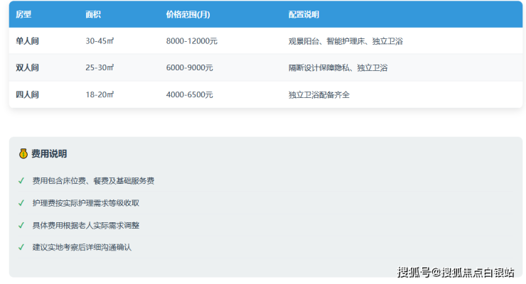 VIP套房:12000元/人/月起(含个性化空间设计、专属护理服务、独立厨房)