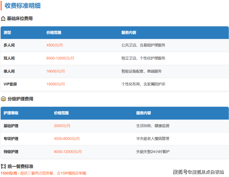 1500元/月,提供三餐两点营养餐,含15种慢病定制餐(如糖尿病餐、低盐餐等)