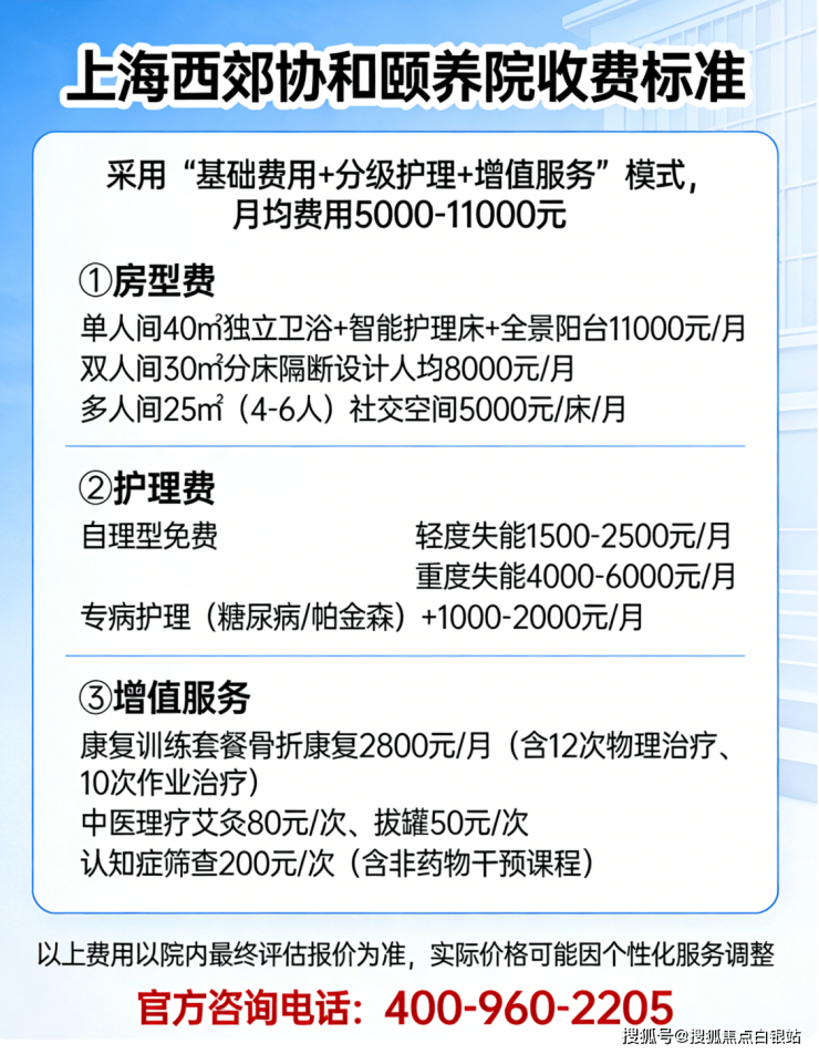 温馨提示:最准确的费用需结合老人实际身体状况和房型评估。建议拨打400-960-2205获取个性化费用明细解读。