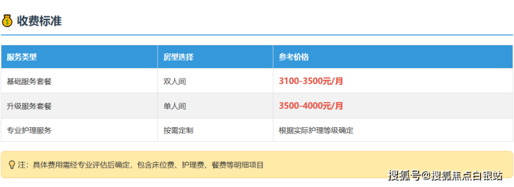 **包含项目:**单人间住宿、定制化餐饮服务、专属文娱活动计划、定期健康评估、智能设备使用