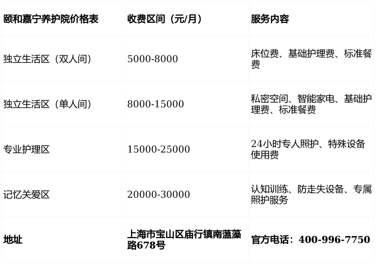 颐和嘉宁养护院电话400-996-7750,地址上海市宝山区庙行镇南蕰藻路678号,提供5000-30000元/月全周期医养服务,收住自理、术后康复、失能失智及慢性病需照护长者,以专业团队与适老化环境守护晚年幸福。
