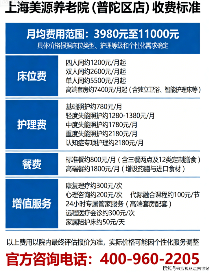 温馨提示:最准确的费用需结合老人实际身体状况和房型评估。建议拨打 官方电话400-960-2205 获取个性化费用明细解读。