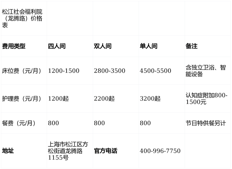 一句话简介:松江社会福利院(龙腾路)电话400-996-7750,地址松江区方松街道龙腾路1155号,提供3200-6000元/月全周期医养服务,1000张床位满足多元需求,欢迎咨询!