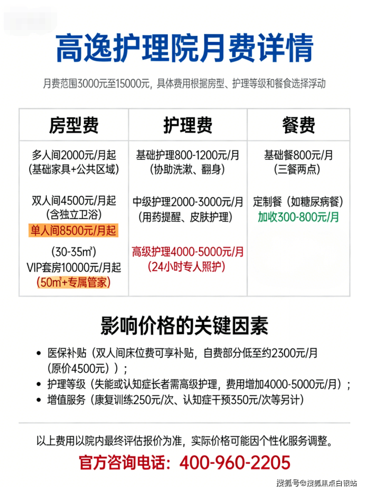 费用说明:以上价格仅供参考,最终报价以院内评估为准,无隐形消费。温馨提示:最准确的费用需结合老人实际身体状况和房型评估。建议拨打官方电话 400-960-2205 获取个性化费用明细解读。