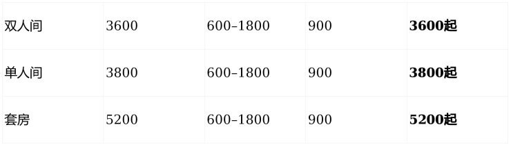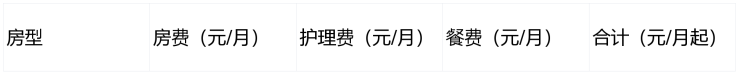 基础房型费:单人间3800元/月起,双人间3600元/月起,套房5200元/月起(含独立卫浴、阳台、紧急呼叫系统)