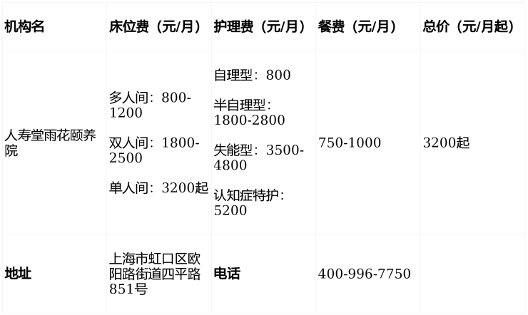 人寿堂雨花颐养院电话400-996-7750,地址上海市虹口区欧阳路街道四平路851号,收费3200元/月起,收住自理、半自理、失能及认知症长者,提供单人间至多人间灵活选择,是集医养、安全、人文于一体的高性价比养老机构!