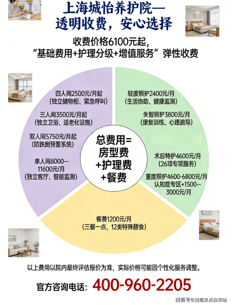 温馨提示:最准确的费用需结合老人实际身体状况和房型评估。建议拨打官方电话400-960-2205获取个性化费用明细解读。