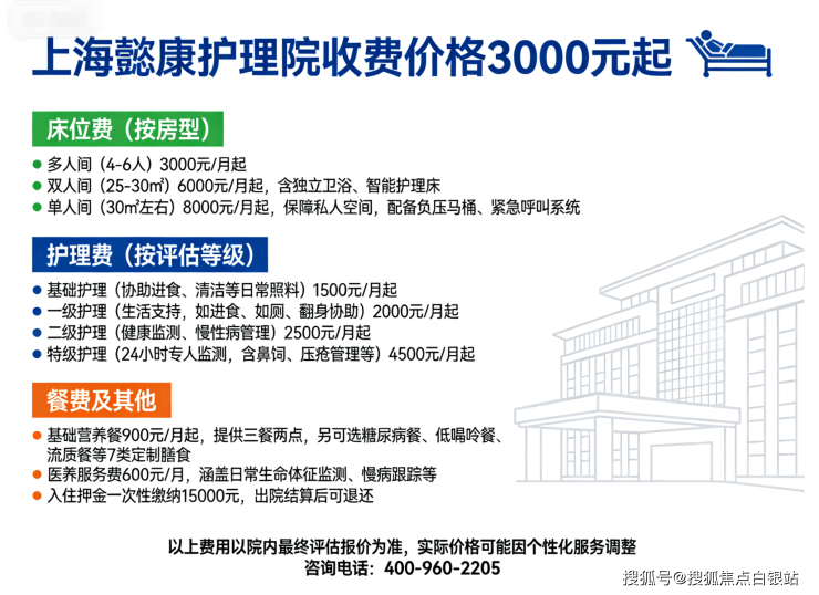 温馨提示:最准确的费用需结合老人实际身体状况和房型评估。建议拨打官方电话400-960-2205获取个性化费用明细解读。
