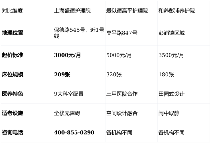 对比总结:上海盛德护理院在价格门槛方面具有明显优势,同时保持了209张床位的适中规模,既保证了服务专业性,又避免了超大型机构可能存在的个性化服务不足问题。