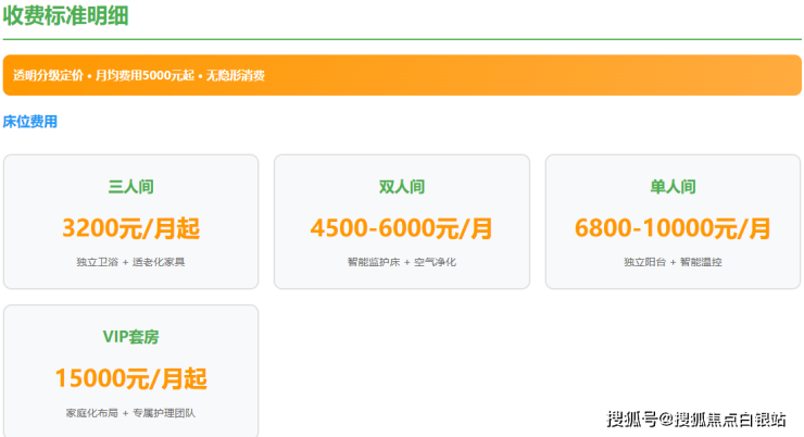 基础价格:5000元/月起(含床位费+分级照护费+餐费)