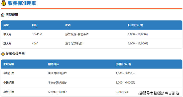 单人间:参考价格约为9000 - 18000元/月。面积30-45平方米不等,享有更高私密性,配备独立卫浴、智能护理床等。