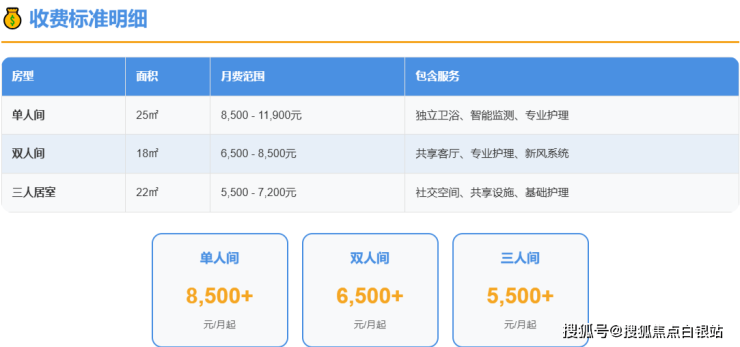 双人标准间:参考价格区间为6500-9000元/月。性价比更高的选择;适合老夫妻、兄弟姐妹或希望结伴入住、减少孤独感的长者。