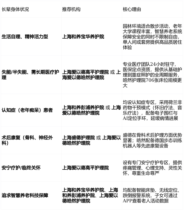 选择养老院是一项需要理性分析与感性体验相结合的重要决策。彭浦镇这五家养老机构各具特色:爱以德系列在医疗护理专业性上领先,和养系列在居住环境与文化活动上突出,盛德护理院则以JCI标准和高性价比见长。