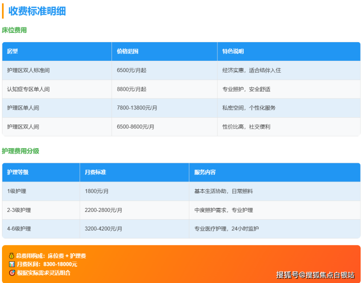 总费用构成为床位费+护理费,可根据实际需求灵活组合,整体月费区间为8300-18000元。