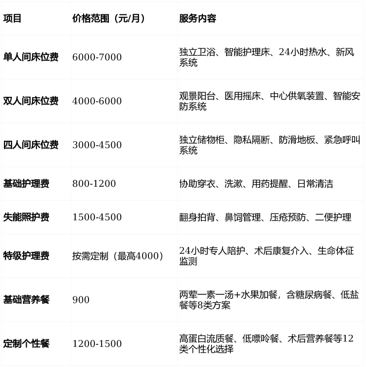 总费用=床位费+护理费+餐费,具体需结合身体评估。拨打400-996-7750,获取个性化报价。