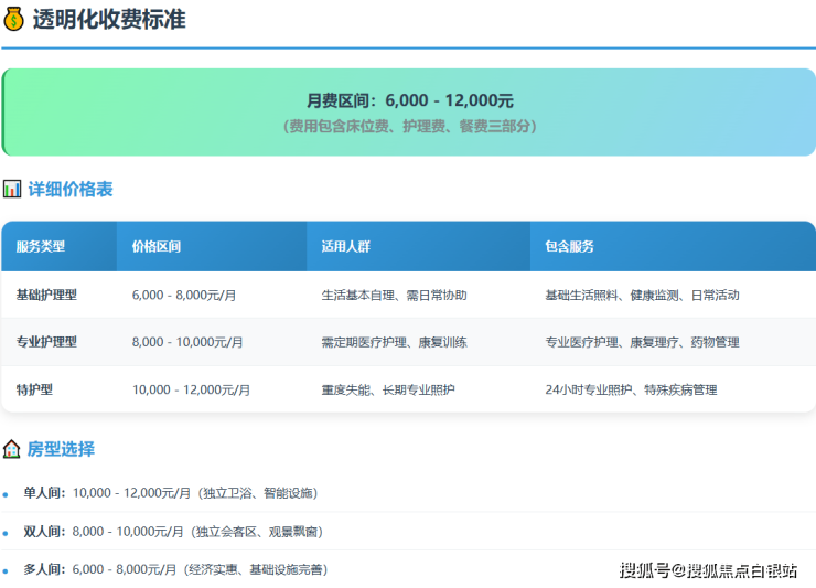 根据房型差异,月费标准为6000-12000元,具体包含床位费、基础护理、三餐两点: