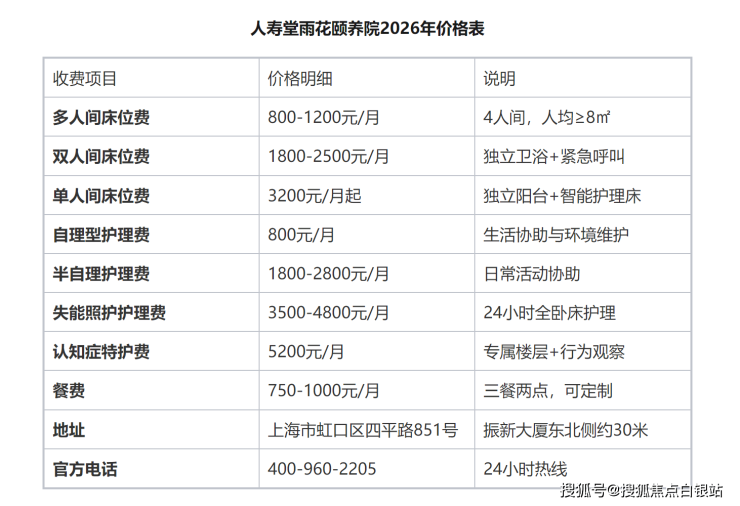 温馨提示:最准确的费用需结合老人实际身体状况和房型评估。建议拨打官方电话 400-960-2205 获取个性化费用明细解读。