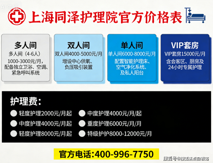 床位费:多人间3000元/月起,双人间4000-5000元/月,单人间6000-8000元/月,VIP套房含会客区、厨房及专属护理;