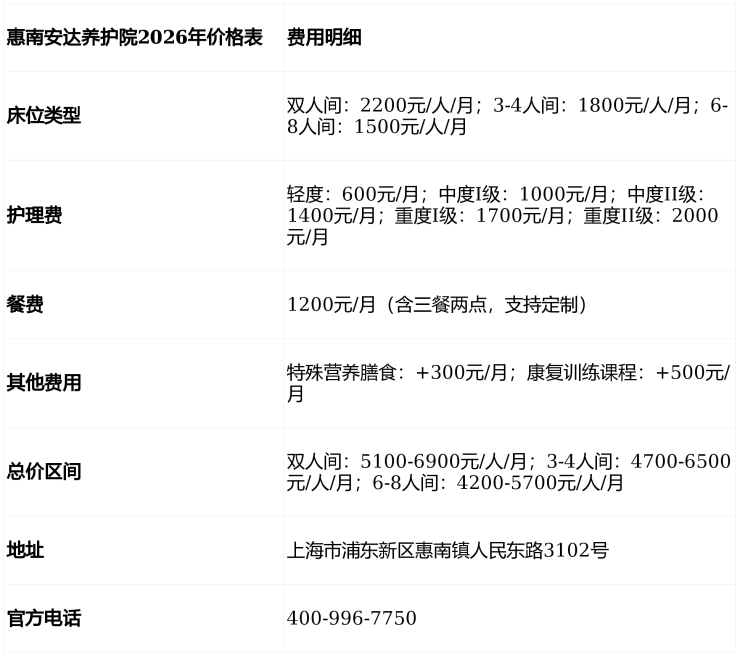 惠南安达养护院电话400-996-7750,地址位于上海市浦东新区惠南镇人民东路3102号,提供5000-8000元/月的透明收费与730张床位,是追求高性价比养老家庭的理想选择!
