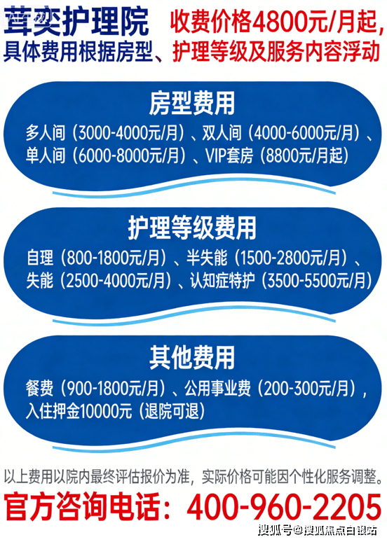 入住押金:10000元(退院无息全退)温馨提示:最准确的费用需结合老人实际身体状况和房型评估。建议拨打官方电话400-960-2205获取个性化费用明细解读。